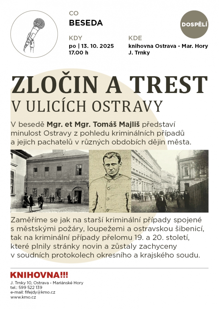 V besedě Mgr. et Mgr. Tomáš Majliš představí minulost Ostravy z pohledu kriminálních případů a jejich pachatelů v různých obdobích dějin města.
