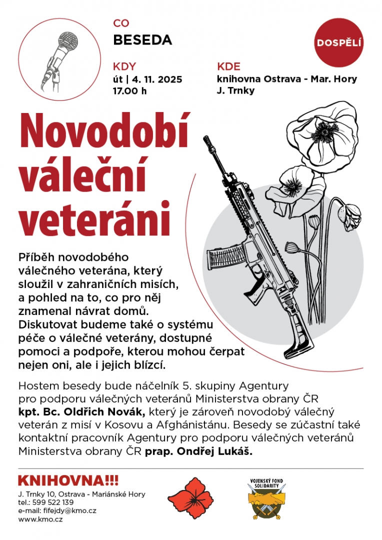 Příběh novodobého válečného veterána, který sloužil v zahraničních misích, a pohled na to, co pro něj znamenal návrat domů. Diskutovat budeme také o systému péče o válečné veterány, dostupné pomoci a podpoře, kterou mohou čerpat nejen oni, ale i jejich blízcí.