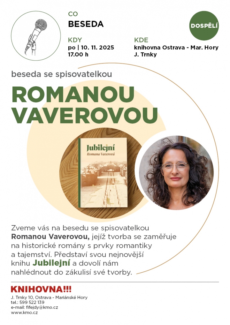 KMO Vás zve na besedu spisovatelkou Romanou Veverovou, jejíž tvorba se zaměřuje na historické romány s prvky romantiky a tajemství. Představí sou nejnovější knihu Jubilejní a dovolí nám nahlédnout do zákulisí své tvorby.