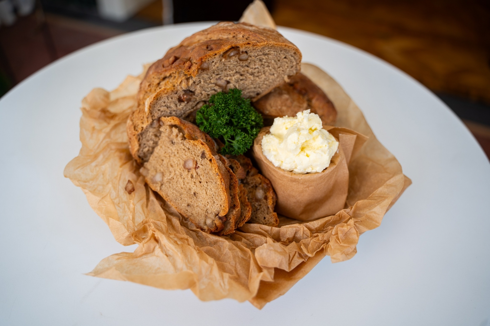 - welcome likér a amouse-bouche (domácí kmínový chléb a šlehané přepuštěné máslo)