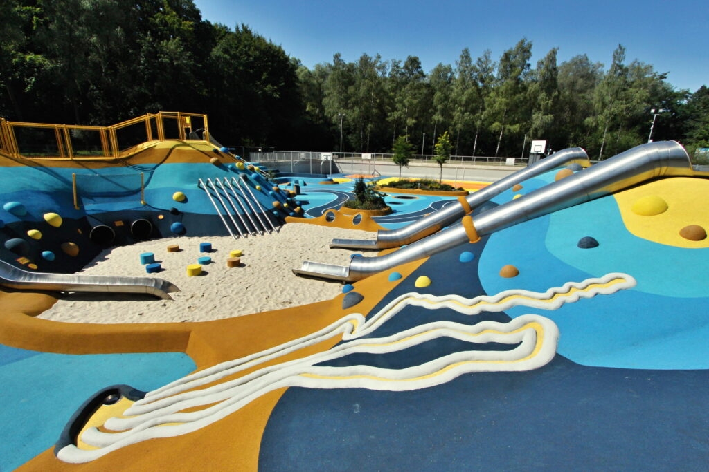 Děti se mohou těšit na rozmanité herní prvky, včetně lanových sestav, houpaček, lanového iglú, vestavěných trampolín, pump track dráhy, tobogánů a skluzavek.