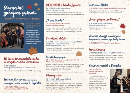 Zveme Vás na festival Francouzský podzim v Ostravě. Jedná se o bohatý program koncertů, přednášek, debat a ochutnávek pořádaných Alliance Francaise Ostrava. Festival zahájí skupina Van Swing v klubu Parník. Hlavním tématem festivalu je svoboda slova, které je připomínkou 10. výročí útoku na Charlie Hebdo. Během festivalu budete mít možnost ochutnat burgundské víno a místní speciality. Pokud jste fanoušky vážné hudby, tak Vás potěší klavírní recitál Magdalény Kovářové (má za sebou vystoupení v Carnegie Hall) a soirée Carmen.