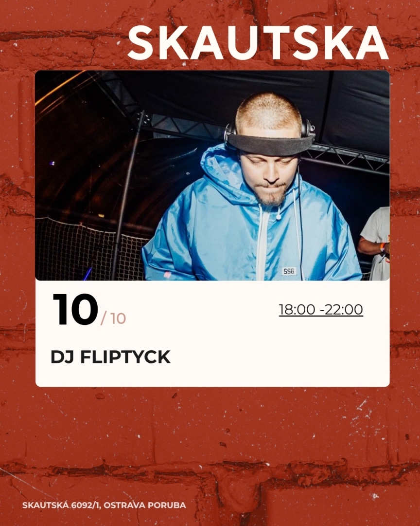 V pátek 10. října se Skautská rozezní hudbou v podání DJ Fliptycka, ostravského rodáka a producenta s více než 15letou kariérou. Na svém kontě má stovky shows po boku předních cz/sk rapových jmen, spolupráci s labelem Gramo Rokkaz i tour s legendární skupinou DMS. Jako koncertní DJ amerického rappera Lord Lhus vystoupil v Polsku, Švýcarsku, Maďarsku, Nizozemsku či Německu. Fliptyck je také členem hudební formace Hipnautica a autor desky Kontrasty s rapperem BonyBones. Ve svém studiu se věnuje nahrávání, mixu a masteringu, na pódiu ale servíruje energické sety plné žánrové rozmanitosti – od klasického boombapu a soulection stylu až po funky, r’n’b, grime i trap. Přijďte si užít jeho jedinečný hudební mix a naladit se na večer plný beatů a energie. Termín: 18:00 – 22:00.