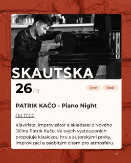 O pohodové večery na Skautské se postará klavírista, improvizátor a skladatel z Nového Jičína Patrik Kačo. Ve svých vystoupeních propojuje klasickou hru s autorskými prvky, improvizací a osobitým citem pro atmosféru.