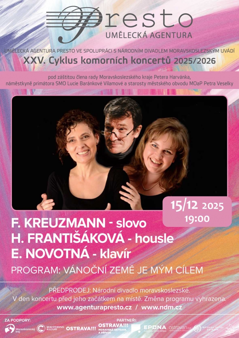 Čas adventu je obdobím ztišení, návratů k příběhům, vůním dětství i hlubokým hudebním emocím. Právě tuto atmosféru přinese prosincový koncert Vánoční země je mým cílem, v němž se propojí slovo a hudba v podání trojice výjimečných umělců: Františka Kreuzmanna (slovo), Elišky Novotné (klavír) a Haliny Františákové (housle). Zazní vánoční povídky a básně proložené skladbami barokních a romantických mistrů.