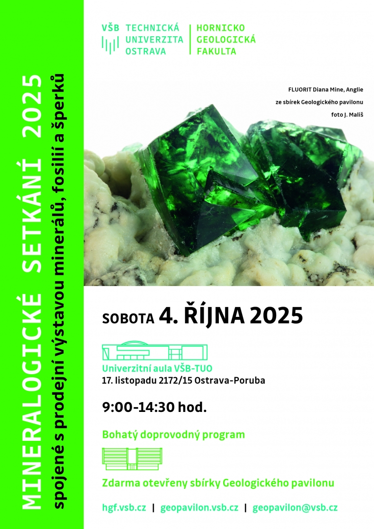 Mineralogické setkání - prodejní výstava minerálů, fosilií, šperků a dalších výrobků z nerostů. Více než 100 vystavovatelů z ČR, Slovenska a Polska nabídne své vzorky na 250m výstavních ploch. Součástí je doprovodný program pro děti i dospělé, připravený pořádající Hornicko-geologickou fakultou. Mimořádně jsou v sobotu otevřeny i rozsáhlé sbírky Geologického pavilonu prof. F. Pošepného, kde je vstup tento den zdarma.