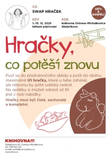 Hračky, co potěší znovu. Pusť se do předvánočního úklidu a pošli do oběhu maximálně tři hračky, které u tebe zahálejí, ale někomu by ještě udělaly radost. Na oplátku si můžeš odnést až tři z jiné naší nabídky. Hračky musí být čisté, zachovalé a kompletní.
