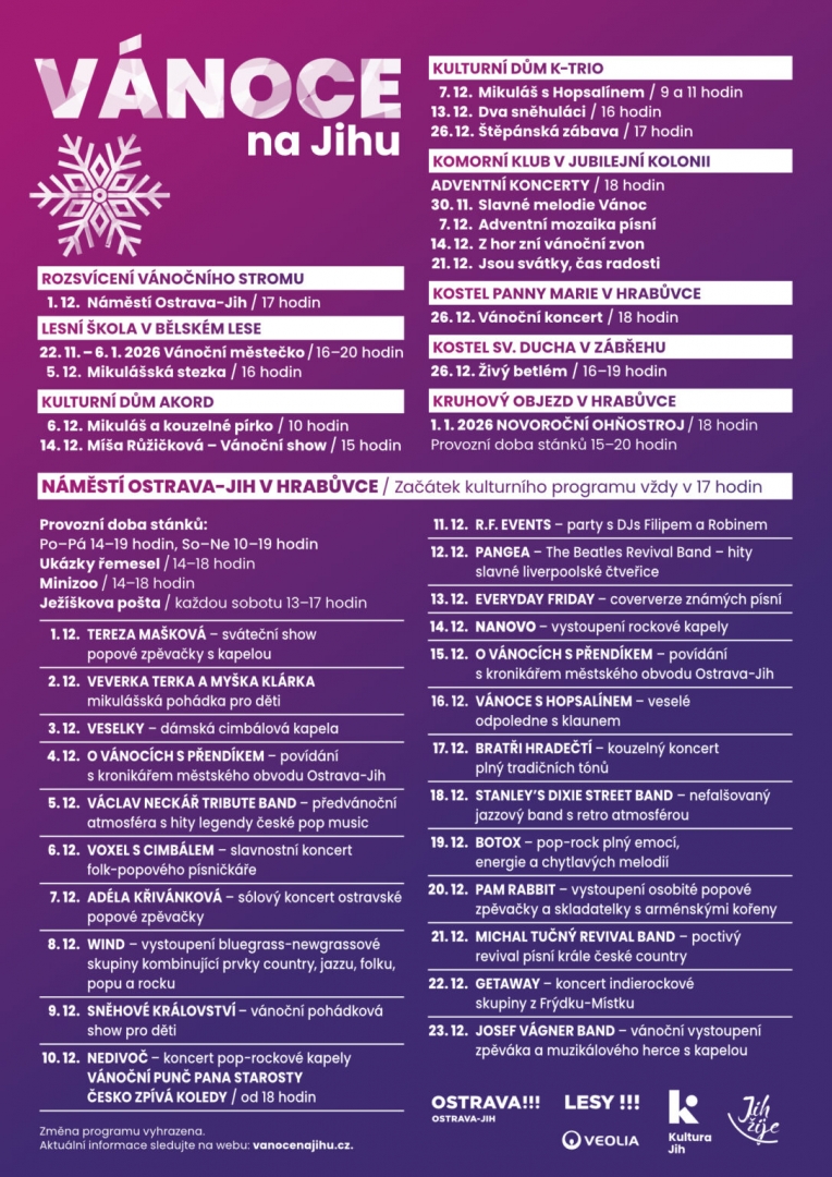 Również w tym roku okres świąt Bożego Narodzenia w Ostrawie-Południe będzie bogaty w przeżycia. Od pierwszej niedzieli Adwentu do Objawienia Pańskiego, dzięki wydarzeniu „Boże Narodzenie na Południu”, rozbrzmiewać będzie muzyka i śmiech. Główne wydarzenia tradycyjnie będą koncentrować się na ostrawskim rynku w Hrabůvce, z codziennym programem od 1 do 23 grudnia. Inne wydarzenia odbędą się między innymi w Miasteczku Bożonarodzeniowym w Bělskim Lesie, skąd na rynek i z powrotem będzie kursował świąteczny pociąg.