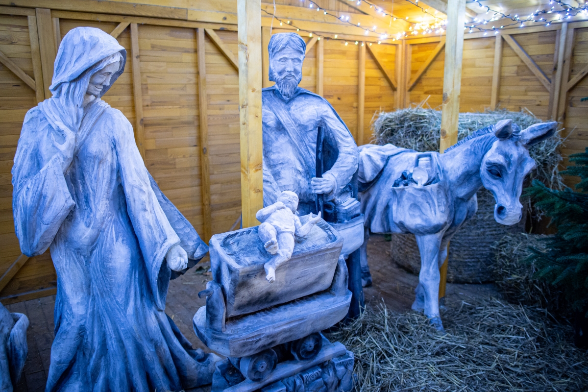 Szopka powstawała przez dwa miesiące w warsztacie rzeźbiarza Romana Mikuša w Vyšních Lhotach i nosi elementy związane z górniczą przeszłością naszego regionu. W 2024 roku do kolekcji drewnianych figurek: Maryi, Józefa, Jezusa, wołu i osiołka, dołączyły również dwie owce z drewna topolowego. Jezus ponownie zostanie umieszczony na drewnianym wozie górniczym, a cała szopka w tym roku zyska zupełnie nowe schronienie.