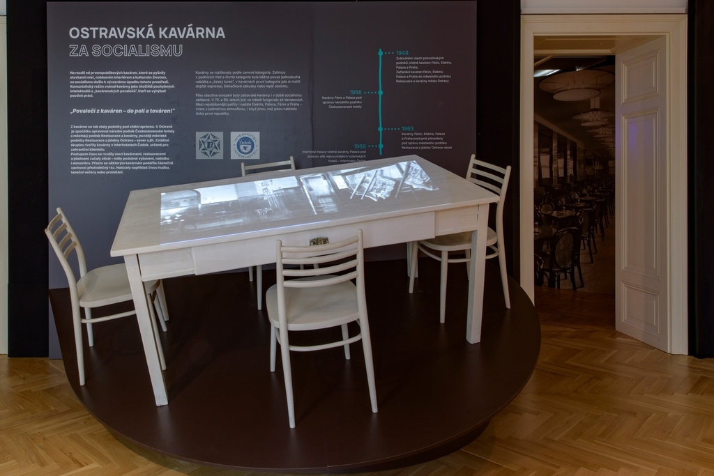„Wybrane kawiarnie, otwarte w złotym wieku kawiarnianej Ostrawy, jako jedyne przetrwały wszystkie zawirowania historii nowożytnej, stając się w ten sposób żywymi świadkami przemian przestrzeni publicznej w czasach wolności i niewolnictwa” – wyjaśnia Eva Ševčíková. Zwiedzający wystawę przejdą przez trzy okresy: od Pierwszej Republiki, przez socjalizm, aż po współczesność. Atmosferę każdego z tych okresów ilustrują autentyczne przedmioty ze świata kawiarni. Na wystawie prezentowane są m.in. kroniki kawiarni Palace Hotel, zabytkowe serwisy porcelanowe, meble, zabytkowe młynki i ekspresy do kawy. „Mamy do dyspozycji ekspres do kawy Merkur z 1943 roku, wypożyczony z Narodowego Muzeum Techniki, który nigdy nie był używany” – dodaje kurator Jiří Sochorek.